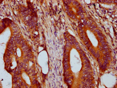 IHC image of CSB-PA882073LA01HU diluted at 1:400 and staining in paraffin-embedded human colon cancer performed on a Leica BondTM system. After dewaxing and hydration, antigen retrieval was mediated by high pressure in a citrate buffer (pH 6.0). Section was blocked with 10% normal goat serum 30min at RT. Then primary antibody (1% BSA) was incubated at 4°C overnight. The primary is detected by a biotinylated secondary antibody and visualized using an HRP conjugated SP system.