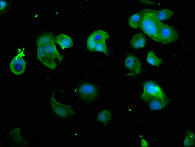 Immunofluorescence staining of MCF-7 cells with CSB-PA018912LA01HU at 1:266, counter-stained with DAPI. The cells were fixed in 4% formaldehyde, permeabilized using 0.2% Triton X-100 and blocked in 10% normal Goat Serum. The cells were then incubated with the antibody overnight at 4°C. The secondary antibody was Alexa Fluor 488-congugated AffiniPure Goat Anti-Rabbit IgG(H+L).