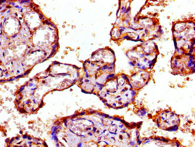 IHC image of CSB-PA018912LA01HU diluted at 1:800 and staining in paraffin-embedded human placenta tissue performed on a Leica BondTM system. After dewaxing and hydration, antigen retrieval was mediated by high pressure in a citrate buffer (pH 6.0). Section was blocked with 10% normal goat serum 30min at RT. Then primary antibody (1% BSA) was incubated at 4°C overnight. The primary is detected by a biotinylated secondary antibody and visualized using an HRP conjugated SP system.