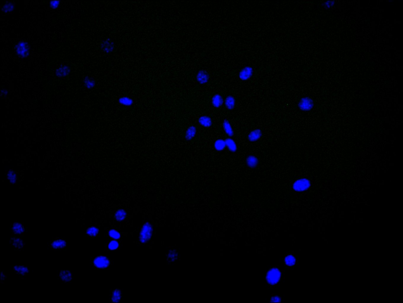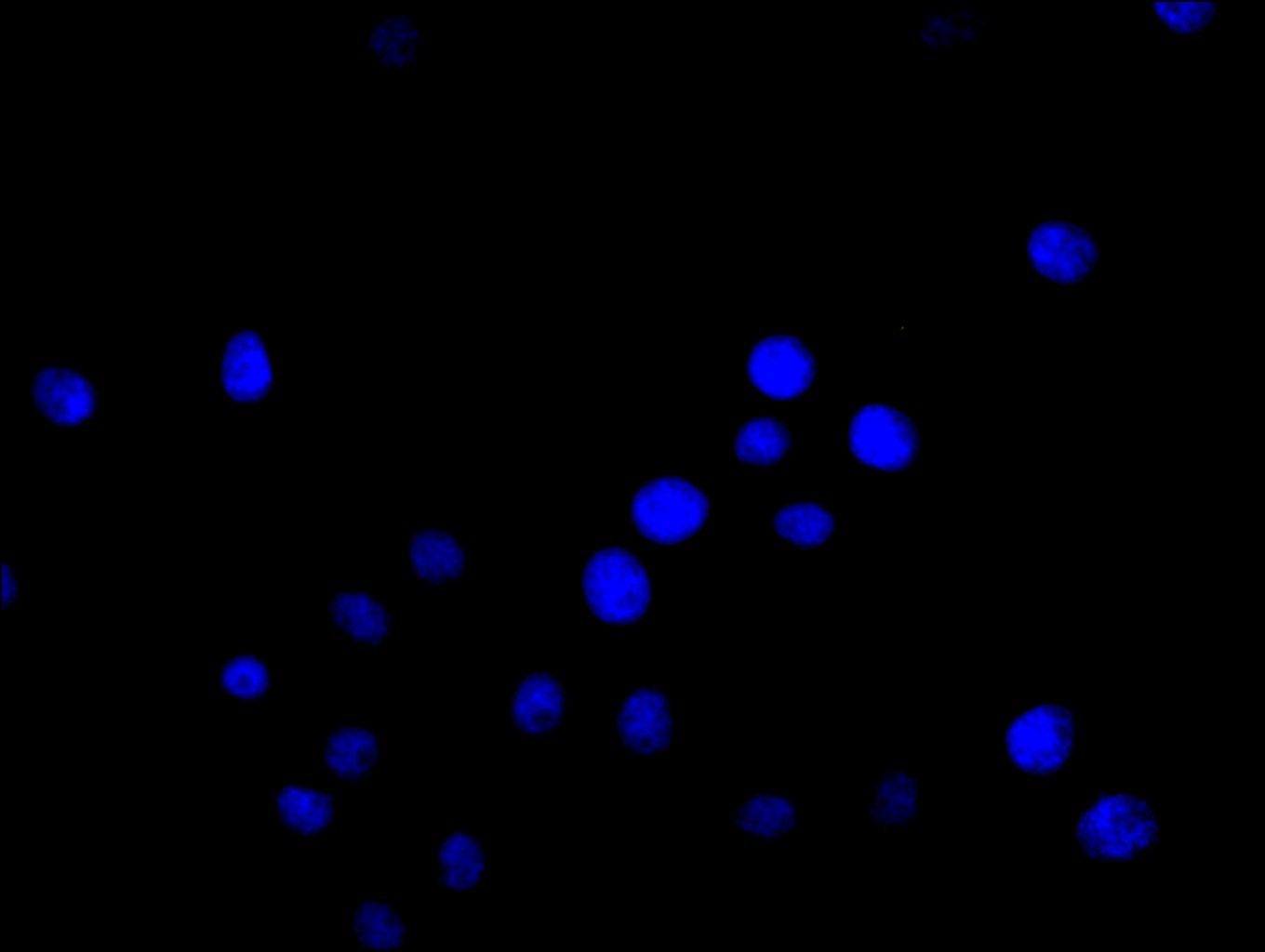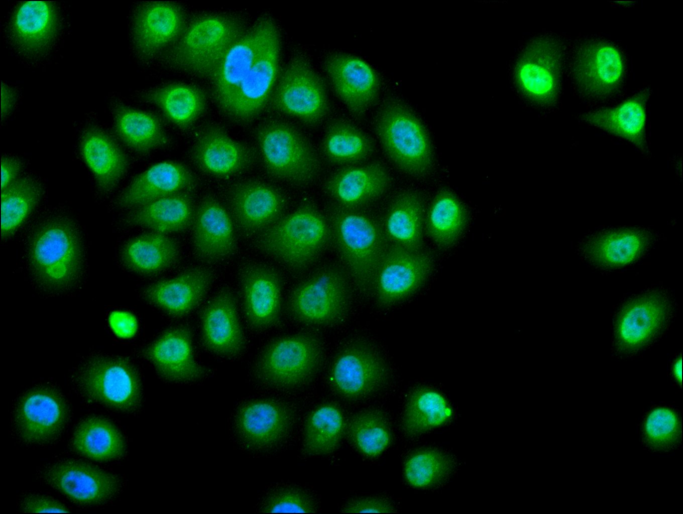 Immunofluorescence staining of A549 cell with CSB-PA020060NA01HU at 1:30, counter-stained with DAPI. The cells were fixed in 4% formaldehyde and blocked in 10% normal Goat Serum. The cells were then incubated with the antibody overnight at 4C. The secondary antibody was Alexa Fluor 488-congugated AffiniPure Goat Anti-Rabbit IgG(H+L).