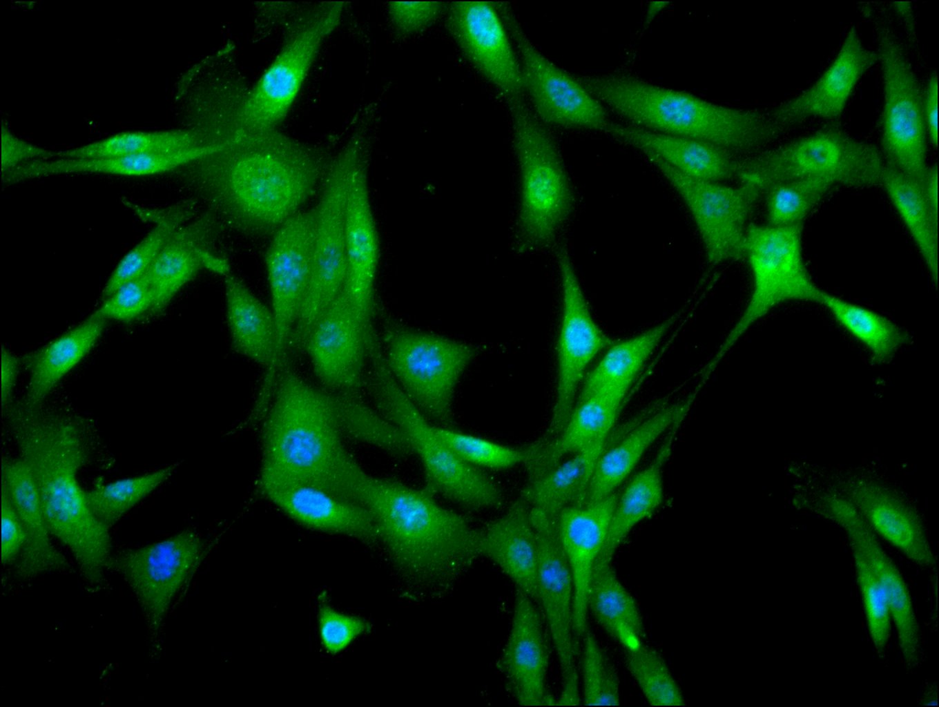 Immunofluorescence staining of NIH/3T3 cell with CSB-PA020060NA01HU at 1:30, counter-stained with DAPI. The cells were fixed in 4% formaldehyde and blocked in 10% normal Goat Serum. The cells were then incubated with the antibody overnight at 4C. The secondary antibody was Alexa Fluor 488-congugated AffiniPure Goat Anti-Rabbit IgG(H+L).