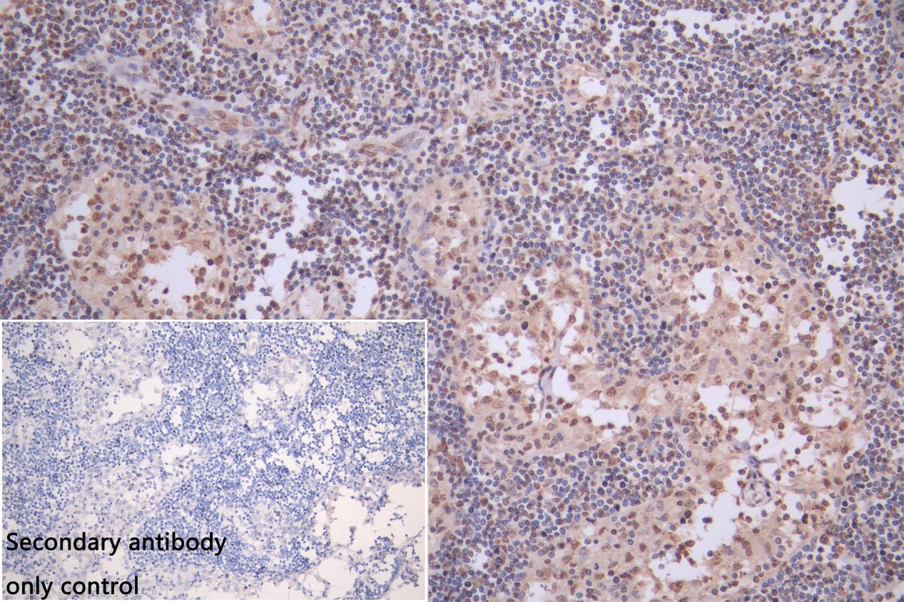 IHC image of CSB-PA020060NA01HU diluted at 1:200 and staining in paraffin-embedded human Lymphnode tissue performed on a Leica BondTM system. After dewaxing and hydration, antigen retrieval was mediated by high pressure in a citrate buffer (pH 6.0). Section was blocked with 10% normal goat serum 30min at RT. Then primary antibody (1% BSA) was incubated at 4°C overnight. The primary is detected by a Goat anti-rabbit polymer IgG labeled by HRP and visualized using 0.05% DAB. Secondary antibody only control: uses 1% BSA instead of primary antibody