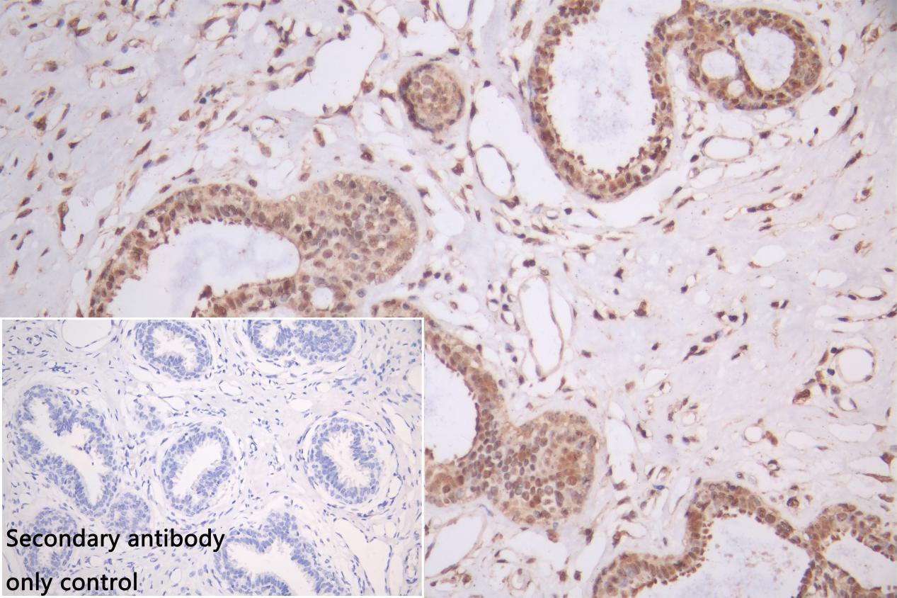 IHC image of CSB-PA020060NA01HU diluted at 1:200 and staining in paraffin-embedded human breast cancer performed on a Leica BondTM system. After dewaxing and hydration, antigen retrieval was mediated by high pressure in a citrate buffer (pH 6.0). Section was blocked with 10% normal goat serum 30min at RT. Then primary antibody (1% BSA) was incubated at 4°C overnight. The primary is detected by a Goat anti-rabbit polymer IgG labeled by HRP and visualized using 0.05% DAB. Secondary antibody only control: uses 1% BSA instead of primary antibody