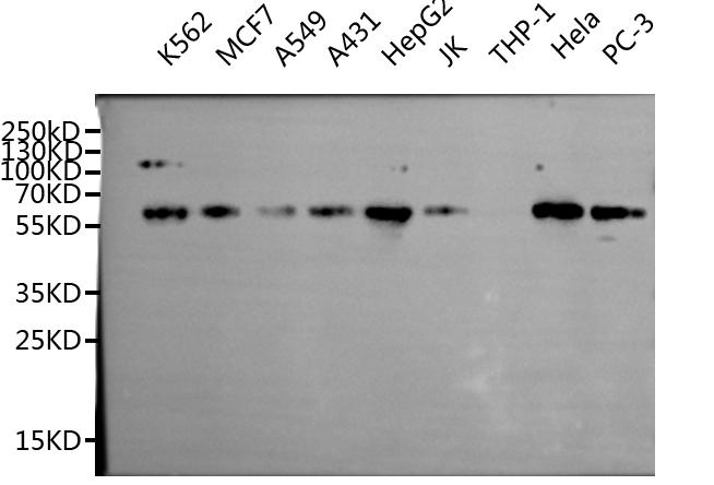 Positive WB detected in: K562 whole cell lysate, MCF7 whole cell lysate, A549 whole cell lysate, A431 whole cell lysate, HepG2 whole cell lysate, JK whole cell lysate, Hela whole cell lysate,PC-3 whole cell lysate