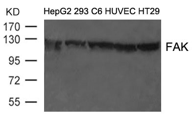• Western blot analysis of extract from HepG2, 293, C6, HUVEC and HT29 cells using FAK(Ab-397) Antibody