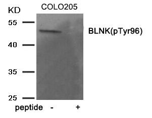 • Western blot analysis of extracts from COLO205 tissue using BLNK (Phospho-Tyr96) antibody.The lane on the right is treated with the antigen-specific peptide.