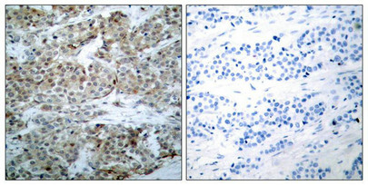 • Immunohistochemical analysis of paraffin-embedded human breast carcinoma tissue using BAD(Phospho-Ser112) Antibody(left) or the same antibody preincubated with blocking peptide(right).