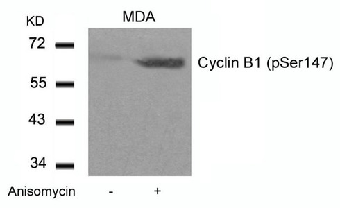 • Western blot analysis of extracts from MDA cells untreated or treated with Anisomycin using Cyclin B1(phospho-Ser147) Antibody.