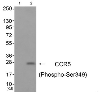 • Western blot analysis of extracts from A549 cells (Lane 2), using CCR5 (Phospho-Ser349) Antibody. The lane on the left is treated with antigen-specific peptide.