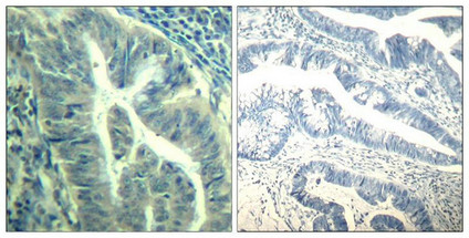 Immunohistochemical analysis of paraffin-embedded human colon carcinoma tissue using CDK6(Phospho-Tyr24) Antibody(left) or the same antibody preincubated with blocking peptide(right).