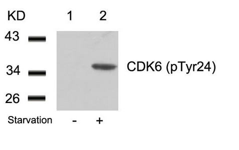 Western blot analysis of extracts from 293 cells untreated(lane 1) or treated with starvation(lane 2) using CDK6(phospho-Tyr24) Antibody.