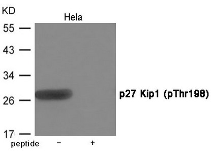 免疫原:Peptide sequence around phosphorylation site of Threonine 198(R-R-R(p)-Q-T) derived from Human p27 Kip1.
