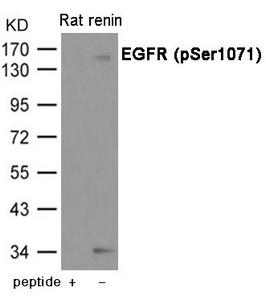 • Western blot analysis of extracts from Rat renin using EGFR (Phospho-Ser1071) Antibody.The lane on the left is treated with the antigen-specific peptide.