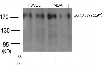 免疫原:Peptide sequence around phosphorylation site of tyrosine 1197 (A-E-Y(p)-L-R) derived from Human EGFR.