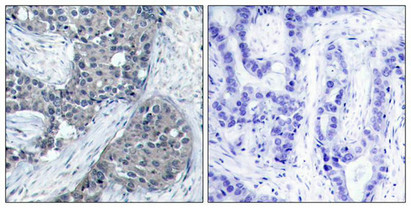 • Immunohistochemical analysis of paraffin-embedded human breast carcinoma tissue using eIF4E(Phospho-Ser209) Antibody(left) or the same antibody preincubated with blocking peptide(right).