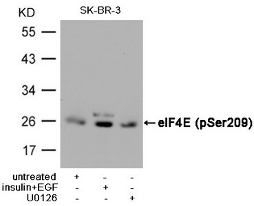 • Western blot analysis of extracts from SK-BR-3 cells, untreated or insulin and EGF treated, and pretreated with U0126 cells, using eIF4E (Phospho-Ser209) Antibody.