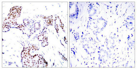 • Immunohistochemical analysis of paraffin-embedded human breast carcinoma tissue using Elk1(Phospho-Ser389) Antibody(left) or the same antibody preincubated with blocking peptide(right).