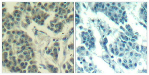 • Immunohistochemical analysis of paraffin-embedded human breast carcinoma tissue using Her3/ErbB3(Phospho-Tyr1328) Antibody(left) or the same antibody preincubated with blocking peptide(right).