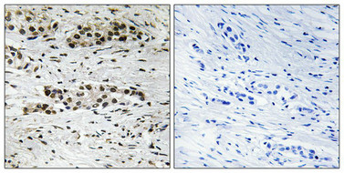 • Immunohistochemical analysis of paraffin-embedded human breast carcinoma tissue using Estrogen Receptor-α (Phospho-Ser102) antibody (left)or the same antibody preincubated with blocking peptide (right).