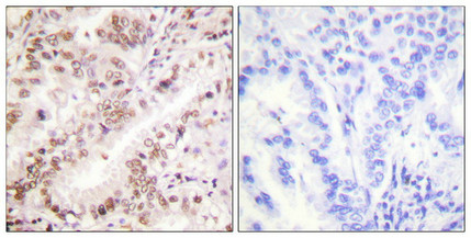 • Immunohistochemical analysis of paraffin-embedded human lung carcinoma tissue using Estrogen Receptor-α (Phospho-Tyr537) antibody (left)or the same antibody preincubated with blocking peptide (right).