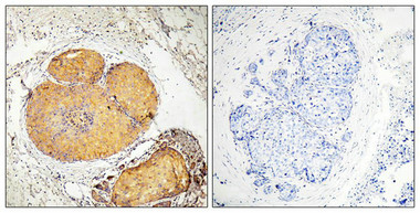 • Immunohistochemical analysis of paraffin-embedded human breast carcinoma tissue, using FADD (Phospho-Ser190) antibody (left)or the same antibody preincubated with blocking peptide (right).