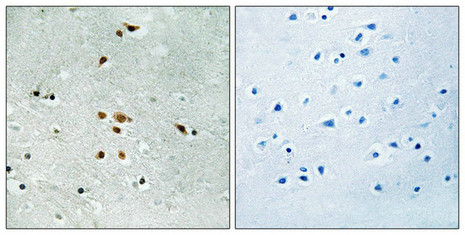 • Immunohistochemical analysis of paraffin-embedded human brain tissue using FER (Phospho-Tyr402) antibody (left)or the same antibody preincubated with blocking peptide (right).