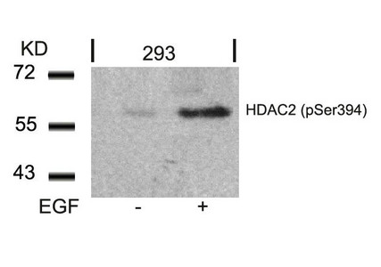 Western blot analysis of extracts from 293 cells untreated or treated with EGF using HDAC2(Phospho-Ser394) Antibody.