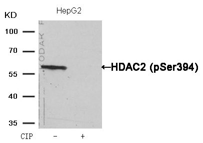Western blot analysis of extracts from HepG2 cells, treated with calf intestinal phosphatase (CIP), using HDAC2 (Phospho-Ser394) Antibody.
