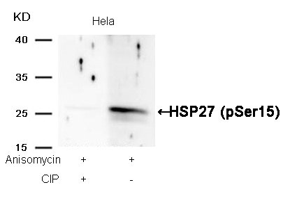 Western blot analysis of extracts from Hela cells, treated with Anisomycin or calf intestinal phosphatase (CIP), using HSP27 (Phospho-Ser15) Antibody.