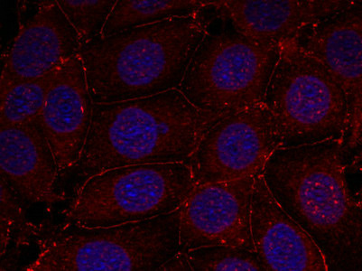 • Immunofluorescence staining of methanol-fixed MCF7 cells using IGF-1R (phospho-Tyr1161) antibody.