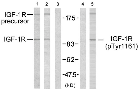 • Western blot analysis using IGF-1R (Ab-1161) antibody (Line 1, 2 and 3) and IGF-1R (phospho-Tyr1161) antibody (Line 4 and 5).