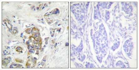 • Immunohistochemical analysis of paraffin-embedded human breast carcinoma tissue, using ITGB4 (Phospho-Tyr1510) antibody (left)or the same antibody preincubated with blocking peptide (right).