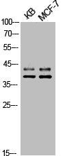 • Western Blot analysis of KB MCF7 cells using Phospho-ERK 1/2 (T202) Polyclonal Antibody