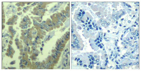 Immunohistochemical analysis of paraffin-embedded human lung carcinoma tissue using MARCKS(Phospho-Ser170) Antibody(left) or the same antibody preincubated with blocking peptide(right).