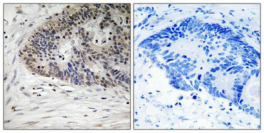 • Immunohistochemistry analysis of paraffin-embedded human colon carcinoma tissue using MDM4 (Phospho-Ser367) antibody. The picture on the right is treated with the synthesized peptide.
