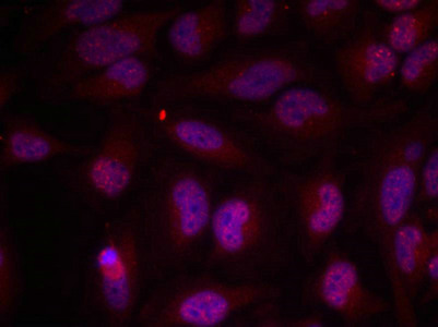 • Immunofluorescence staining of methanol-fixed Hela cells using Myc(Phospho-Thr358) Antibody.