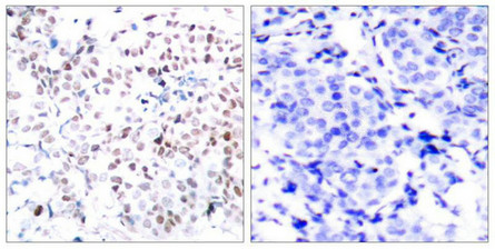 • Immunohistochemical analysis of paraffin-embedded human breast carcinoma tissue using Myc(Phospho-Thr358) Antibody(left) or the same antibody preincubated with blocking peptide(right).