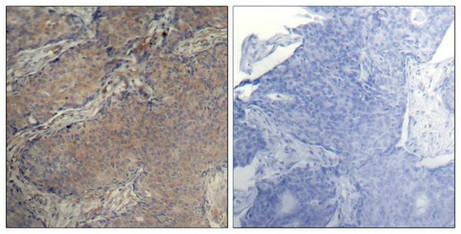 Immunohistochemical analysis of paraffin-embedded human breast carcinoma tissue using Myosin Light Chain 2 (Phospho-Ser19) Antibody (left) or the same antibody preincubated with blocking peptide (right).