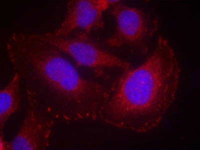 • Immunofluorescence staining of methanol-fixed Hela cells using PLC-g1(phospho-Tyr771) Antibody.
