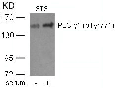 • Western blot analysis of extracts from 3T3 cells untreated or treated with serum using PLC-g1(phospho-Tyr771) Antibody.