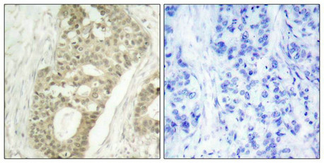 Immunohistochemical analysis of paraffin-embedded human breast carcinoma tissue using PKCd(Phospho-Ser645) Antibody(left) or the same antibody preincubated with blocking peptide(right).