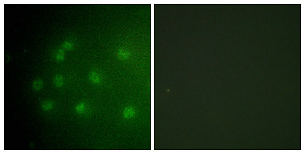 Immunofluorescence analysis of COS7 cells, using Retinoblastoma (Phospho-Thr826) antibody. The picture on the right is treated with the synthesized peptide.
