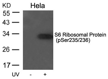 • Western blot analysis of extracts from Hela cells untreated or treated with UV using S6 Ribosomal Protein(Phospho-Ser235/236) Antibody.