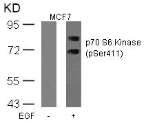 • Western blot analysis of extracts from MCF cells untreated or treated with EGF using p70 S6 Kinase(Phospho-Ser411) Antibody.