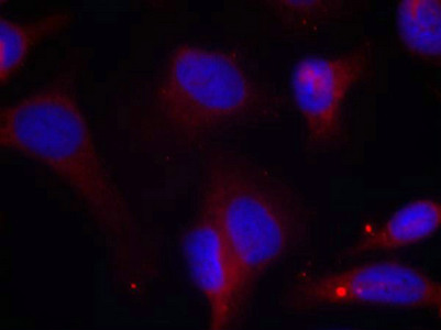Immunofluorescence staining of methanol-fixed Hela cells using Zap-70(Phospho-Tyr319) Antibody.