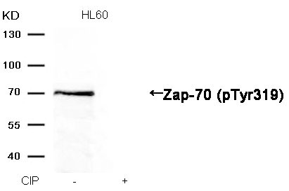 Western blot analysis of extracts from HL60 cells, treated with calf intestinal phosphatase (CIP), using Zap-70 (Phospho-Tyr319) Antibody.