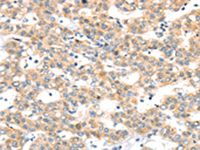 The image on the left is immunohistochemistry of paraffin-embedded Human breast cancer tissue using CSB-PA051869(RAB24 Antibody) at dilution 1/45, on the right is treated with synthetic peptide. (Original magnification: ×200)