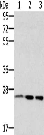 • Gel: 12%SDS-PAGE, Lysate: 40 μg, Lane 1-3: Hela cells, hepg2 cells, Raw264.7 cells, Primary antibody: CSB-PA249917(RAB8A Antibody) at dilution 1/650, Secondary antibody: Goat anti rabbit IgG at 1/8000 dilution, Exposure time: 1 minute