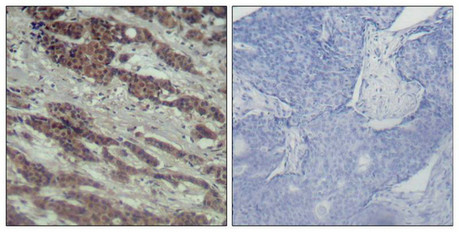 • Immunohistochemical analysis of paraffin-embedded human breast carcinoma tissue using Raf1(Ab-338) Antibody(left) or the same antibody preincubated with blocking peptide(right).