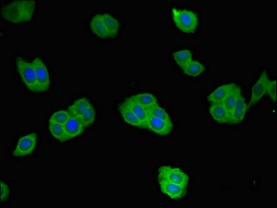 Immunofluorescent analysis of HepG2 cells using CSB-PA12069A0Rb at dilution of 1:100 and Alexa Fluor 488-congugated AffiniPure Goat Anti-Rabbit IgG(H+L)